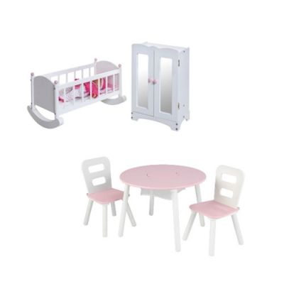 Комплектация: кровать для кукол крупного размера, шкафчик для кукольного белья, стол и 4 стула. Материал изделия: фанера. Покрытие: лак, эмаль.