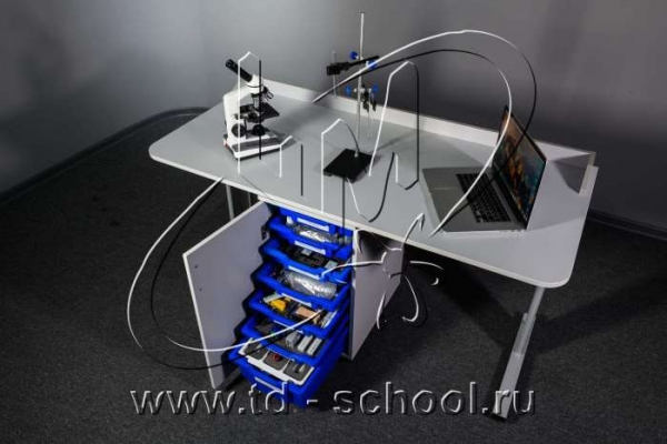 Лабораторный комплекс представляет собой комплект оборудования, включающий в себя лабораторный стол, тумбу, ноутбук*, цифровые датчики и лабораторное оборудование, необходимое для проведения межпредметных работ и исследований по естественнонаучным дисциплинам. Всё основное оборудование уложено в лотки с ложементами и крышками. Для компактного хранения лотков предусмотрена передвижная тумба, которая может распологаться в центре под столешницей стола, либо сбоку рядом со столом. Во втором варианте появляется дополнительная площадь для временного размещения лабораторного оборудования.